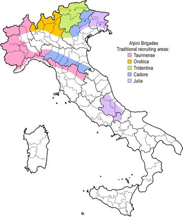The Alpini are the Italian Army's specialist mountain infantry. Part of the army's infantry corps, the speciality distinguished itself in combat during World War I and World War II. Currently the active Alpini units are organized in two operational brigades, which are subordinated to the Alpine Troops Headquarters. The Alpini's name comes from their inceptive association with the Alps, the mountain range that Italy shares with France, Switzerland, Austria, and Slovenia. An individual soldier of the Alpini is called Alpino.