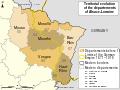 Shading showing départements before 1870 with black lines after 1871. Only the département of Meurthe changed its name and became Meurthe-et-Moselle after the border changes. The border between 1871 and 1918 is shown in yellow.