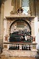 Monument to Sir Edward Denny and his wife at Waltham Abbey Church (1600). The kneeling figures in the frieze below depict his ten children and are known as "weepers". In the spandrels, allegorical figures of Fame and Time look on.