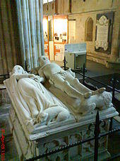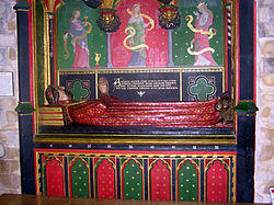 The earliest English church monuments were simple stone coffin-shaped grave coverings incised with a cross or similar design; the hogback form is one of the earliest types. The first attempts at commemorative portraiture emerged in the 13th century, executed in low relief, horizontal but as in life. Gradually these became full high-relief effigies, usually recumbent, as in death, and, by the 14th century, with hands together in prayer. In general, such monumental effigies were carved in stone, marble or wood, or cast in bronze or brass. Often the stone effigies were painted to resemble life, but on the vast majority of medieval monuments, the paint has long since disappeared. The cross-legged attitude of many armoured figures of the late 13th or early 14th centuries was long supposed to imply that the deceased had served in the Crusades, had taken crusading vows, or more specifically had been a Knight Templar; but these theories are now rejected by scholars.[1][2] Feet were often supported by stylised animals, usually either a lion indicating valour and nobility (generally for men), or a dog indicative of loyalty (generally for women).[3] Sometimes the footrest was an heraldic beast from the deceased's family coat of arms.
