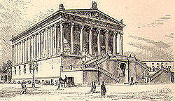 Friedrich August Stüler began working on a design for the building in 1863, based on a sketch by King Frederick William IV of Prussia.[3] Two years and two failed plans later, his third proposal was finally accepted. Stüler died before planning was completed and Carl Busse handled the remaining details in 1865. In 1866, by order of the king and his cabinet, the Kommission für den Bau der Nationalgalerie (Commission for the construction of the national gallery) was created. Ground was broken in 1867 under the supervision of Heinrich Strack. In 1872 the structure was completed and interior work began. The opening took place on March 22, 1876, in the presence of the Kaiser.