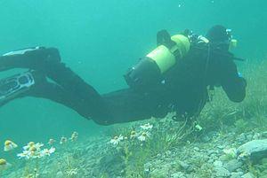 Altitude diving is underwater diving using scuba or surface supplied diving equipment where the surface is 300 metres (980 ft) or more above sea level (for example, a mountain lake).[1][2] Altitude is significant in diving because it affects the decompression requirement for a dive, so that the stop depths and decompression times used for dives at altitude are different from those used for the same dive profile at sea level.[3] The U.S. Navy tables recommend that no alteration be made for dives at altitudes lower than 91 metres (299 ft) and for dives between 91 and 300 metres correction is required for dives deeper than 44 metres (144 ft) of sea water.[4] Most recently manufactured decompression computers can automatically compensate for altitude.