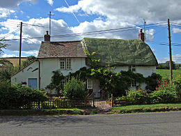 Alton Pancras civil parish covers 920 hectares (2,280 acres) at the head of the valley of the River Piddle.[3] The valley is on the dip slope of the Dorset Downs and drains from north to south. Several small side combes extend east and west. In the east the parish includes part of a tributary valley at Watcombe Bottom, north of Plush, and in the northeast it extends north of the escarpment to Alton Common in the Blackmore Vale.[14] The underlying geology of the parish is mostly chalk, except for the Alton Common extension, which is on greensand, gault and Kimmeridge clay.[3] Alton Pancras village is sited in the valley near the source of the River Piddle at an altitude of about 125 metres (410 ft). The altitude of the parish is between about 255 metres (837 ft) at its highest point on the hills to the west, to about 110 metres (360 ft) at its lowest point where the river leaves the parish in the south.[14] The broadcaster and agriculturist Ralph Wightman, who was born and lived in the nearby village of Piddletrenthide, described the hills surrounding the village as "very much in the centre of Dorset".[15] All of Alton Pancras parish is within the Dorset Area of Outstanding Natural Beauty.[16] Horse Close Wood on Alton Common is a Woodland Trust wood, though it is not open to the public.[14][17]