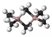 A variety of compounds of empirical formula AlR3 and AlR1.5Cl1.5 exist.[50] The aluminium trialkyls and triaryls are reactive, volatile, and colorless liquids or low-melting solids. They catch fire spontaneously in air and react with water, thus necessitating precautions when handling them. They often form dimers, unlike their boron analogues, but this tendency diminishes for branched-chain alkyls (e.g. Pri, Bui, Me3CCH2); for example, triisobutylaluminium exists as an equilibrium mixture of the monomer and dimer.[51][52] These dimers, such as trimethylaluminium (Al2Me6), usually feature tetrahedral Al centers formed by dimerization with some alkyl group bridging between both aluminium atoms. They are hard acids and react readily with ligands, forming adducts. In industry, they are mostly used in alkene insertion reactions, as discovered by Karl Ziegler, most importantly in "growth reactions" that form long-chain unbranched primary alkenes and alcohols, and in the low-pressure polymerization of ethene and propene. There are also some heterocyclic and cluster organoaluminium compounds involving Al–N bonds.[51]