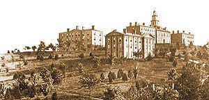 On September 10, 1794, two years before Tennessee became a state and at a meeting of the legislature of the Southwest Territory at Knoxville, Blount College was established with a charter.[10] The new, all-male, non-sectarian institution struggled for 13 years with a small student body and faculty, and in 1807, the school was rechartered as East Tennessee College as a condition of receiving the proceeds from the settlement devised in the Compact of 1806. When Samuel Carrick, its first president and only faculty member, died in 1809, the school was temporarily closed until 1820. When it reopened, it began experiencing growing pains. Thomas Jefferson had previously recommended that the college leave its confining single building in the city and relocate to a place it could spread out. Coincidentally, in the Summer of 1826 (the year that Thomas Jefferson died), the trustees explored "Barbara Hill" (today known simply as The Hill) as a potential site and relocated there by 1828.[11] In 1840, the college was elevated to East Tennessee University (ETU). The school's status as a religiously non-affiliated institution of higher learning was unusual for the period of time in which it was chartered, and the school is generally recognized as the oldest such establishment of its kind west of the Appalachian Divide.[12]