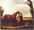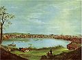 Fisher traveled throughout the northeastern United States searching out sites of landscape beauty such as the views of Springfield, Hartford, and Providence and the spectacular scenery of the White Mountains of New Hampshire. He sketched outdoors and began to compose pastoral scenes in his studio before Thomas Cole, Thomas Doughty, Asher B. Durand, or others of the Hudson River School gave serious attention to nature. The Watering Place, 1816, now in the collection of Fruitlands Museum, Harvard, Massachusetts, is his earliest extant pure landscape. His paintings of Niagara Falls, commissioned by Judge Daniel Appleton White of Salem, Massachusetts, were completed following his visit there in 1820.[1] His interest in depicting topographical subjects was activated when he obtained a commission to paint views of Harvard College. These paintings were executed expressly for the purpose of issuing engravings for wide distribution to the public. The images of Harvard Yard were later reproduced on Stafforshire transfer-printed earthenware produced by several English companies for the American market. He was commissioned by Charles Henry Hall, owner of the Harlem Stud Farm in New York, to paint portraits of the famous American race horses of the period. He completed at least six portraits of the renowned American Eclipse between 1822 and 1823. Lithograph prints made from these paintings were used in The American Turf Register, the first magazine attempting to improve the breeding of thoroughbred horses in America.
