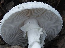 Gills are closely spaced and free from the stem. They are cream at first, but can turn white as the mushroom matures. Short-gills are frequent. Stem is white, measuring 10–20 cm (3.9–7.9 in) long and 1–2 cm (0.39–0.79 in) thick. It tapers slightly to the top, smooth to shaggy in texture. There is a ring, thick and often double-edged, the underside being tissuelike. The universal veil hangs from the top of the stipe.[7] The basal bulb is considerably large in size, with concentric circles of down-turned scales. The volval remnants stick to it and cause irregular patches.[7]