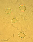 The gills are adnate to adnexed, and white; they are close together, with little intervening space. The pale yellowish stem is 4–12 cm (1.6–4.7 in) long by 0.5–1.9 cm (0.2–0.7 in) thick, and either roughly equal in width throughout, or slightly thicker at the base. Young mushrooms have a membranous partial veil extending from the upper stem to the cap margin; as the mushroom grows, the partial veil tears to leave a flimsy, skirt-like, easily lost ring on the stem. At the base of the stem is a white volva (a remnant of the universal veil that covered the immature mushroom) that usually forms a small, free rim. Spore prints are white.[10] There is no distinctive odour.[12]