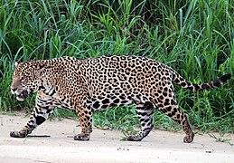 The rainforest contains several species that can pose a hazard. Among the largest predatory creatures are the black caiman, jaguar, cougar, and anaconda. In the river, electric eels can produce an electric shock that can stun or kill, while piranha are known to bite and injure humans.[46] Various species of poison dart frogs secrete lipophilic alkaloid toxins through their flesh. There are also numerous parasites and disease vectors. Vampire bats dwell in the rainforest and can spread the rabies virus.[47] Malaria, yellow fever and dengue fever can also be contracted in the Amazon region.