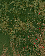 Prior to the early 1960s, access to the forest's interior was highly restricted, and the forest remained basically intact.[51] Farms established during the 1960s were based on crop cultivation and the slash and burn method. However, the colonists were unable to manage their fields and the crops because of the loss of soil fertility and weed invasion.[52] The soils in the Amazon are productive for just a short period of time, so farmers are constantly moving to new areas and clearing more land.[52] These farming practices led to deforestation and caused extensive environmental damage.[53] Deforestation is considerable, and areas cleared of forest are visible to the naked eye from outer space.