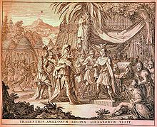 They are heard of in the time of Alexander, when some of the king's biographers make mention of Amazon Queen Thalestris visiting him and becoming a mother by him (the story is known from the Alexander Romance). However, several other biographers of Alexander dispute the claim, including the highly regarded secondary source, Plutarch. In his writing he makes mention of a moment when Alexander's secondary naval commander, Onesicritus, was reading the Amazon passage of his Alexander history to King Lysimachus of Thrace who was on the original expedition: the king smiled at him and said "And where was I, then?"