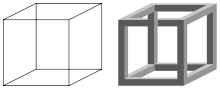 Logical ambiguity and self-contradiction is analogous to visual ambiguity and impossible objects, such as the Necker cube and impossible cube, or many of the drawings of M. C. Escher.[7]