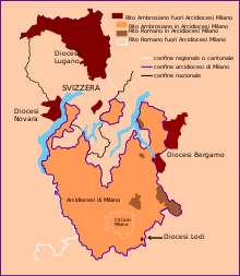 The Ambrosian Rite, also called the Milanese Rite, is a Catholic Western liturgical rite. The rite is named after Saint Ambrose, a bishop of Milan in the fourth century. The Ambrosian Rite, which differs from the Roman Rite, is used by some five million Catholics in the greater part of the Archdiocese of Milan, Italy (excluding, notably, the areas of Monza, Treviglio, Trezzo sull'Adda and a few other parishes), in some parishes of the Diocese of Como, Bergamo, Novara, Lodi, and in about fifty parishes of the Diocese of Lugano, in the Canton of Ticino, Switzerland.