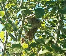 The nest is built in late summer by the female in the branches of a deciduous shrub or tree at a height of up to 10 m (33 ft). The nest-building lasts approximately six days, during which time the female works in 10–40 minute increments. The male frequently flies with the female as she collects nesting materials, and though he may carry some materials back to the nest, he leaves its construction to the female. The outer shell of the nest is built of bark, weeds, vines, and grass.[23] The inside diameter of the finished nest is about 6.5 cm (2.6 in).[22] The rim is reinforced with bark bound by spiderwebs and caterpillar silk, and the cup is lined with plant down from milkweed, thistle, or cattail. The nest is so tightly woven that it can hold water, and it is possible for nestlings to drown following a rainstorm if the parents do not cover the nest.[17]