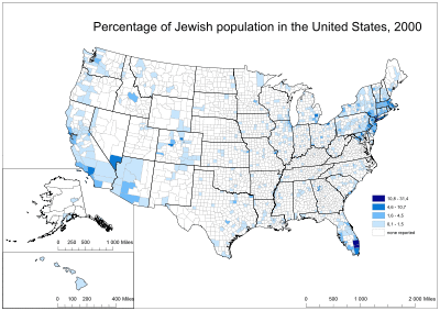 American Jews or Jewish Americans are Americans who are Jews, whether by religion, ethnicity, culture, or nationality.[6] Today the Jewish community in the United States consists primarily of Ashkenazi Jews, who descend from diaspora Jewish populations of Central and Eastern Europe and comprise about 90–95% of the American Jewish population.[7][8]
