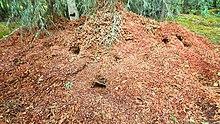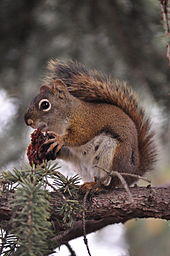 American red squirrels are primarily granivores, but incorporate other food items into their diets opportunistically.[6] In Yukon, extensive behavioral observations suggest white spruce seeds (Picea glauca) comprise over 50% of a red squirrel's diet, but squirrels have also been observed eating spruce buds and needles, mushrooms, willow (Salix sp.) leaves, poplar (Populus sp.) buds and catkins, bearberry (Arctostaphylos sp.) flowers and berries, and animal material such as bird eggs or even snowshoe hare leverets (young).[10] White spruce cones mature in late July and are harvested by red squirrels in August and September. These harvested cones are stored in a central cache and provide energy and nutrients for survival over the winter and reproduction the following spring. The fallen scales from consumed seed cones can collect in piles, called middens, up to twelve meters across.[11] White spruce exhibits two- to six-year masting cycles, where a year of superabundant cone production (mast year)[12] is followed by several years in which few cones are produced.[13] American red squirrel territories may contain one or several middens.