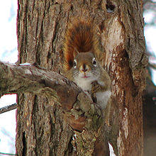 The American red squirrel (Tamiasciurus hudsonicus) is one of three species of tree squirrels currently classified in the genus Tamiasciurus, known as the pine squirrels (the others are the Douglas squirrel, T. douglasii, and Mearns's squirrel, T. mearnsi). The American red squirrel is variously known as the pine squirrel, North American red squirrel and chickaree. It is also referred to as Hudson's Bay squirrel, as in John James Audubon's work The Viviparous Quadrupeds of North America (hence the species name). The squirrel is a small, 200–250 g (7.1–8.8 oz), diurnal mammal that defends a year-round exclusive territory. It feeds primarily on the seeds of conifer cones, and is widely distributed across North America wherever conifers are common, except on the Pacific coast, where its cousin, the Douglas squirrel, is found instead. The American red squirrel is not found on most of the Great Plains or in the southeastern United States, except for the Blue Ridge Mountains, as conifer trees are not common in those areas.