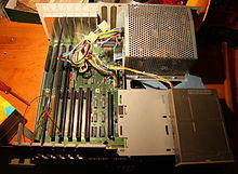 The Amiga 2000, or A2000, is a personal computer released by Commodore in March 1987.[2][3][4] It was introduced as a "big box" expandable variant of the Amiga 1000 but quickly redesigned to share most of its electronic components with the contemporary Amiga 500 for cost reduction. Expansion capabilities include two 3.5" drive bays (one of which is used by the included floppy drive) and one 5.25" bay that can be used by a 5.25" floppy drive (for IBM PC compatibility), a hard drive, or CD-ROM once they became available.