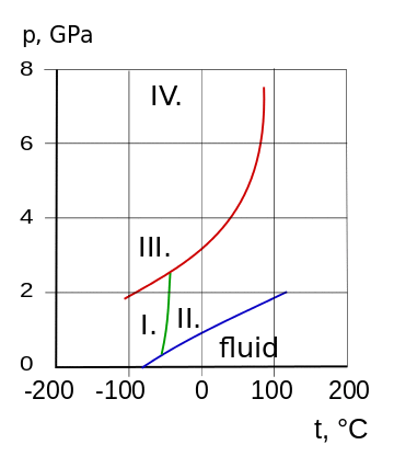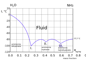 | Freezing curve of ammonia-water system. Three eutectic points I. II. and III. are shown. Left of the I. point the frozen component is ice. Right of the III. point the frozen component is ammonia.[4]