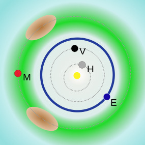 | Mars (M) Mars trojans Venus (V) Mercury (H) | Sun Amor asteroids Earth (E) |
