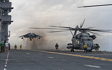 Due to their aircraft carrier heritage, all amphibious assault ships resemble aircraft carriers in design. The flight deck is used to operate attack and utility helicopters for landing troops and supplies and on some ship types also launch and recover Harrier Jump Jets to provide air support to landing operations. STOL aircraft such as the OV-10 were sometimes deployed on and were able to perform short take-offs and landings on large-deck amphibious assault ships without needing catapults or arresting wires, although for safety and clearance reasons, the latter was most often not permitted.[12] Landing craft are also carried, either on deck-mounted davits, or in an internal well dock (well deck in USN).
