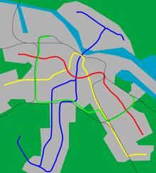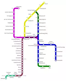 There are 33 full metro stations,[1] Since Route 52 on the new North-South Line opened, six additional stations and 9.5 kilometres (5.9 mi) of route have been added to the metro system,[17] yielding a new combined network length of 52 kilometres (32 mi).[18] In 2019, sneltram Route 51 no longer operates into the metro network. The southern sneltram portion was closed for conversion to be incorporated into the tram network.[19]