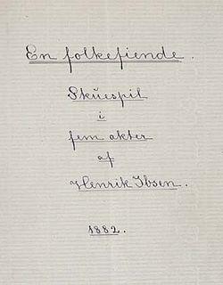 An Enemy of the People (original Norwegian title: En folkefiende) is an 1882 play by Norwegian playwright Henrik Ibsen. Ibsen wrote it in response to the public outcry against his previous play, Ghosts, which challenged the hypocrisy of 19th-century morality. According to Ellen Mortensen (Ibsen Studies v.7, 169), the words "scandalous", "degenerate," and "immoral" were hurled at both Ghosts and its author because it openly discussed adultery and syphilis. Therefore, An Enemy of the People tells the story of a man who dares to speak an unpalatable truth, and is punished for it. However, Ibsen took a somewhat skeptical view of his protagonist, suggesting that he may have gone too far in his zeal to tell the truth. Ibsen wrote to his publisher: "I am still uncertain as to whether I should call [An Enemy of the People] a comedy or a straight drama. It may [have] many traits of comedy, but it also is based on a serious idea."