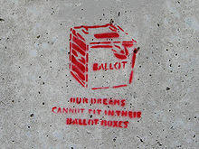 While most anarchists firmly oppose voting, or otherwise participating in the state institution, there are a few that disagree. The prominent anarchist Pierre-Joseph Proudhon stood for election to the French Constituent Assembly twice in 1848. In the 1890s, Paul Brousse developed the concept of libertarian municipalism in Switzerland which involved participating in local elections.[85] Anarchists have opposed voting for multiple reasons. Taking part in elections has historically resulted in radicals becoming part of the system they oppose rather than ending it.[86] Voting acknowledges the state's legitimacy.[87]