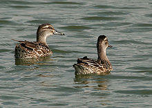 Some care is needed in separating the brown female from the similar common teal, but the stronger face markings and more frequent head-shaking when dabbling are good indicators. Confusion with the female of the blue-winged teal is also possible, but the head and bill shape is different, and the latter species has yellow legs. Pale eyebrow, dark eye line, pale lore spot bordered by a second dark line.[11]