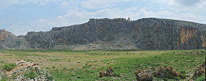 It was founded by Assyrians. It was situated on the Pyramus. According to the Suda, the original name of the place was Cyinda or Kyinda or Quinda (Greek: Κύϊνδα); that it was next called Diocaesarea.[2] How the city obtained the name Anazarbus (Ἀνάζαρβος) or Anazarba (Ἀνάζαρβα), as it was also known, is a matter of conjecture. According to Stephanus of Byzantium, after the city was destroyed by an earthquake, the emperor Nerva sent thither one Anazarbus, a man of senatorial rank, who rebuilt the city, and gave to it his own name.[3] This account cannot be accurate, as Valesius remarks,[4] for it was called Anazarbus in Pliny's time.[5] Dioscorides is called a native of Anazarbus; but the period of Dioscorides is not certain. It was also the home of the poet Oppian. Its later name was Caesarea ad Anazarbum, and there are many medals of the place in which it is both named Anazarbus and Caesarea at or under Anazarbus. On the division of Cilicia it became the chief place of the Roman province of Cilicia Secunda, with the title of Metropolis. It suffered dreadfully from an earthquake both in the time of Eastern Roman emperor Justinian I, and, still more, in the reign of his successor Justin I. After Justinian rebuilt the place, it was renamed Justinianopolis or Ioustinianoupolis (Ἰουστινιανούπολις). Rebuilt by Justin I after the earthquake in the 6th century, it became Justinopolis or Ioustinoupolis (Ἰουστινούπολις) (525); but the old name persisted, and when Thoros I, king of Lesser Armenia, made it his capital early in the 12th century, it was known as Anazarva.