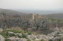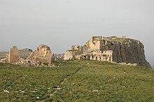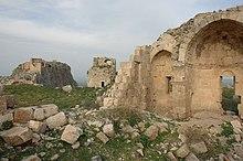 In late 1097 or early 1098 it was captured by the armies of the First Crusade and was incorporated into Bohemond's Principality of Antioch. The Crusaders are probably responsible for the construction of an impressive donjon atop the center of the outcrop. Most of the remaining fortifications, including the curtain walls, massive horse-shaped towers, undercrofts, cisterns, and free-standing structures date from the Armenian periods of occupation, which began with the arrival of the Rubenid Baron T‛oros I, c. 1111.[6] The site briefly exchanged hands between the Greeks and Armenians, until it was formally part of the Armenian Kingdom of Cilicia. Within the fortress are two Armenian chapels and the magnificent (but severely damaged) three-aisle church built by T‛oros I to celebrate his conquests.[7][8] The church was once surrounded by a continuous, well-executed dedicatory inscription in Armenian.