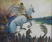 They did as told; the white horse went for three days, looking neither right nor left, not stopping for a graze, not letting itself to be disturbed by other horses playing in the pastures by the path. Finally, it stopped in front of Přemysl, who was just ploughing his field with two oxen. To welcome the delegation, Přemysl turned his plough upside down and served some bread with salt on top of the iron part of it. Then they brought him back to Libuše, who married him with great joy and made him the first Duke.