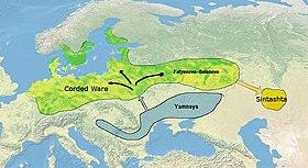 The Sintashta culture, also known as the Sintashta-Petrovka culture[46] or Sintashta-Arkaim culture,[47] is a Bronze Age archaeological culture of the northern Eurasian steppe on the borders of Eastern Europe and Central Asia, dated to the period 2100–1800 BC.[48] It is probably the archaeological manifestation of the Indo-Iranian language group.[49]