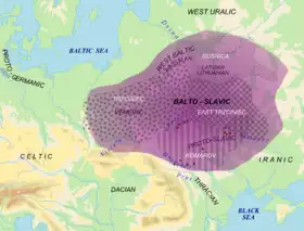 Throughout the 1st millennium CE, the large presence of the Sarmatians who once dominated Ukraine, Southern Russia, and swaths of the Carpathians, gradually started to diminish mainly due to assimilation and absorption by the Germanic Goths, especially from the areas near the Roman frontier, but only completely by the Proto-Slavic peoples. The abundant East Iranian-derived toponyms in Eastern Europe proper (e.g. some of the largest rivers; the Dniestr and Dniepr), as well as loanwords adopted predominantly through the Eastern Slavic languages and adopted aspects of Iranian culture amongst the early Slavs, are all a remnant of this. A connection between Proto-Slavonic and Iranian languages is also furthermore proven by the earliest layer of loanwords in the former.[78] For instance, the Proto-Slavonic words for god (*bogъ), demon (*divъ), house (*xata), axe (*toporъ) and dog (*sobaka) are of Scythian origin.[79]