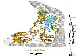 Though simple and compound walls were often used, great houses were primarily constructed of core-and-veneer walls: two parallel load-bearing walls comprising dressed, flat sandstone blocks bound in clay mortar were erected.[17] Gaps between walls were packed with rubble, forming the wall's core. Walls were then covered in a veneer of small sandstone pieces, which were pressed into a layer of binding mud.[17] These surfacing stones were often placed in distinctive patterns.
