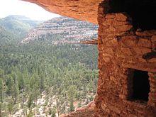 Not all of the people in the region lived in cliff dwellings; many colonized the canyon rims and slopes in multifamily structures that grew to unprecedented size as populations swelled.[19] Decorative motifs for these sandstone/mortar constructions, both cliff dwellings and not, included T-shaped windows and doors. This has been taken by some archaeologists, such as Stephen Lekson (1999), as evidence of the continuing reach of the Chaco Canyon elite system, which had seemingly collapsed around a century before.[22] Other researchers see these motifs as part of a more generalized Puebloan style and/or spiritual significance, rather than evidence of a continuing specific elite socioeconomic system.[23]