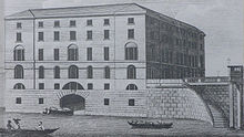 The phrase "dark Satanic Mills", which entered the English language from this poem, is often interpreted as referring to the early Industrial Revolution and its destruction of nature and human relationships.[10] This view has been linked to the fate of the Albion Flour Mills in Southwark, the first major factory in London. This rotary steam-powered flour mill by Matthew Boulton and James Watt could produce 6,000 bushels of flour per week. The factory could have driven independent traditional millers out of business, but it was destroyed in 1791 by fire, perhaps deliberately. London's independent millers celebrated with placards reading, "Success to the mills of Albion but no Albion Mills."[11] Opponents referred to the factory as satanic, and accused its owners of adulterating flour and using cheap imports at the expense of British producers. A contemporary illustration of the fire shows a devil squatting on the building.[12] The mills were a short distance from Blake's home.