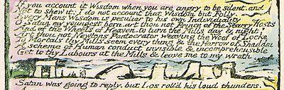 Stonehenge and other megaliths are featured in Milton, suggesting they may relate to the oppressive power of priestcraft in general; as Peter Porter observed, many scholars argue that the "[mills] are churches and not the factories of the Industrial Revolution everyone else takes them for".[17] An alternative theory is that Blake is referring to a mystical concept within his own mythology related to the ancient history of England. Satan's "mills" are referred to repeatedly in the main poem, and are first described in words which suggest neither industrialism nor ancient megaliths, but rather something more abstract: "the starry Mills of Satan/ Are built beneath the earth and waters of the Mundane Shell...To Mortals thy Mills seem everything, and the Harrow of Shaddai / A scheme of human conduct invisible and incomprehensible".[18]
