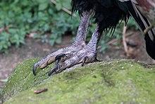The middle toe is greatly elongated, and the hind one is only slightly developed, while the talons of all the toes are comparatively straight and blunt. The feet are thus more adapted to walking, and are of little use as weapons or organs of prehension as in birds of prey and Old World vultures.[26] The beak is hooked, and adapted to tear rotting meat.[27] The irises of the male are brown, while those of the female are deep red.[28] They have no eyelashes.[29] Unlike the case with most other birds of prey,[30] the female is smaller.[31]