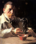 While his early works were often brilliant, luminous watercolors, by 1887 he had switched firmly to oils. Zorn was a prolific artist. He became an international success as one of the most acclaimed portrait painters of his era. His sitters included three American Presidents, nobility, the Swedish king and queen and numerous members of high society. Zorn also painted portraits of family members, friends, and self-portraits. Zorn is also noted for his nude paintings.[1] His fondness of painting full-figured women gave rise to the terms Zorn kulla or dalkulla, an unmarried woman or girl from Dalarna, as the women were called in the local dialect of the region Zorn lived.