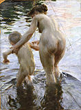 The paintings have the freedom and energy of sketches, using warm and cool light and shade areas[1] with contrasting areas of warm and cool tones, and an understanding of colour contrasts and reflected lights. Zorn's accomplished use of the brush allows the forms and the texture of the painted subject to reflect and transmit light. In addition to portraits and nudes, Zorn excelled in realistic depictions of water, as well as scenes depicting rustic life and customs.