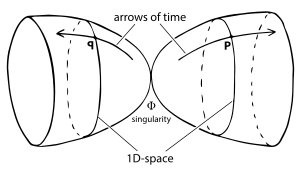In his first model the two universes did not interact, except via local matter accumulation whose density and pressure become high enough to connect the two sheets through a bridge without spacetime between them, but with a continuity of geodesics beyond the Schwarzschild radius with no singularity, allowing an exchange of matter between the two conjugated sheets, based on an idea after Igor Dmitriyevich Novikov.[35] Novikov called such singularities a collapse and an anticollapse, which are an alternative to the couple black hole and white hole in the wormhole model. Sakharov also proposed the idea of induced gravity as an alternative theory of quantum gravity.[36]