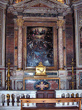 In 1922, the Bolsheviks moved the corpse, later described by an American journalist as a "remarkably well-preserved mummy",[5] to the Museum of Hygiene of People's Commissioners of Health in Moscow. The whereabouts of the remains was not known to the Catholic authorities, and Pope Pius XI charged the Papal Famine Relief Mission in Russia, headed by American Jesuit Father Edmund A. Walsh, with the task of locating and "rescuing" them.[5] In October 1923—as a kind of "pay" for help during famine—the remains were released to Walsh and his Assistant Director, Father Louis J. Gallagher, S.J. Well-packed by the two Jesuits, they were delivered to the Holy See by Gallagher on All Saints' Day (1 November) 1923.[5][6] In May 1924, the relics were installed in Rome's Church of the Gesù, the main church of the Society of Jesus.[6]