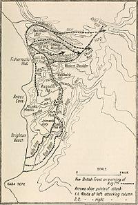 In August 1915, Russell's brigade participated in the Battle of Sari Bair, an attempt to break the stalemate that existed at Gallipoli. Commanding a contingent of Maori pioneers in addition to his own brigade, the Turkish positions at No. 3 Outpost, Table Top Hill and Bauchop's Hill, guarding the approach to the Sari Bair ridge, were captured in a well organised attack on the night of 6 August. Russell took care to ensure his men fully understood their roles and the tactics to be used.[43] Originally, Russell's brigade was to have been the spearhead of the attack on Chunuk Bair itself but was shunted into the supporting role of securing the approach.[44] The capture of the Turkish positions cleared the way for the New Zealand Infantry Brigade to make its way up the slopes of Chunuk Bair. Heavy losses were incurred amongst the infantry making an initial attack during daylight hours. A nighttime attack was planned using two squadrons of Russell's command together with the Wellington Infantry Battalion. This succeeded and the peak of Chunuk Bair was captured in the early hours of 8 August. The peak was exposed to gunfire from neighbouring Hill Q, which made it difficult to dig in. The battalion held Chunuk Bair for a day until relieved by the Otago Infantry Battalion and two more squadrons of Russell's mounteds. The peak was lost the following day after it was handed over to two British battalions and the Sair Bair ridge remained in Turkish hands.[45] Later, Godley regretted the change to the original plan, considering that Russell, after taking the approaches to the Sari Bair ridge, could have proceeded on and secured Chunuk Bair and Hill Q with his brigade.[46]