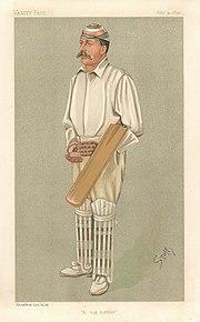 Born in Westoe, South Shields, County Durham, England,[1] he was the youngest son of a wine merchant, who moved the whole family to Marylebone, London, in 1877. Stoddart made his reputation in club cricket and was playing for Middlesex by 1885. He was a flamboyant right-handed batsman and a right arm medium pace bowler. He played 16 Test matches captaining England in eight games of which he won three, lost four and drew one. His 173 at Melbourne in 1894/95 was, for 80 years, the highest score by an England captain in Test cricket in Australia.[2] Stoddart was also the first England captain to ask Australia to bat first, and the first to declare a Test innings closed.[1]