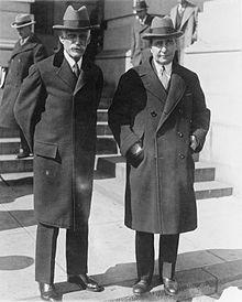 Responsibility for foreign relations lay with the State Department rather than the Treasury Department, and the Benjamin Strong Jr. and other central bankers took the lead with regard to international monetary policy, but Mellon nonetheless exercised some influenced in foreign affairs.[75] He strongly opposed the cancellation of European debts from World War I, but recognized that Britain and other countries would be unable to pay those debts without a renegotiation of terms. In 1923, Mellon and British Chancellor of the Exchequer Stanley Baldwin negotiated an agreement in which Britain promised to pay off the debts over a 62-year period.[76] After the adoption of the Dawes Plan, Mellon reached debt settlements with several other European countries. After protracted negotiations, the United States and France agreed to the Mellon-Berenger Agreement, which reduced France's debt and set terms for repayment.[77]