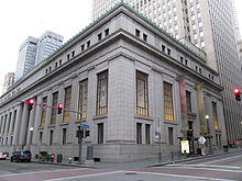 Numerous financial institutions failed in the months prior to Roosevelt's inauguration, but Mellon National Bank, the Union Trust Company, and another Mellon banking operation, Mellbank Corporation, were all able to avoid closure.[100] Mellon strongly opposed Roosevelt's New Deal policies, especially the 1933 Banking Act, which required a separation between commercial and investment banking.[101] Mellon believed that the various New Deal policies, including Social Security and unemployment insurance, undermined the free market system that had produced one of the largest economies in the world. Aside from banking reform, other New Deal policies, including regulations on utilities and coal mines and laws designed to promote labor unions, also affected Mellon's business empire. Additionally, the Revenue Act of 1934 and the Revenue Act of 1935 rescinded many of Mellon's tax policies and contained other provisions that were designed to increase taxation on top earners and corporations.[102]