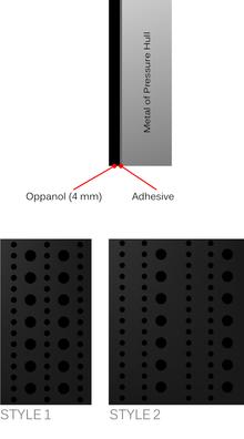 The modern materials consist of a number of layers and many different sized voids, each targeted at a specific sound frequency range at different depths. Different materials are sometimes used in different areas of the submarine to better absorb specific frequencies associated with machinery at that location inside the hull.