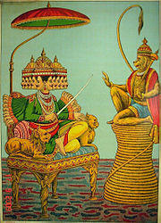 Angada and Tara are instrumental in reconciling Rama and his brother, Lakshmana, with Sugriva after Sugriva fails to fulfill his promise to help Rama find and rescue his wife. Together they are able to convince Sugriva to honor his pledge to Rama instead of spending his time carousing and drinking.[3] Sugriva then arranges for vanaras to help Rama and organises the monkey army that will battle Ravana's demonic host. Angada led the particular search party which consisted of Hanuman and Jambavant and was able to find Sita, Rama's wife.[4]