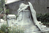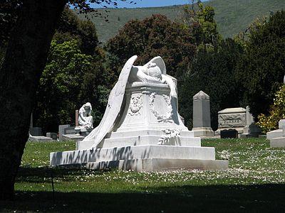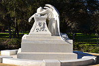 Prominent replicas of the Angel of Grief sculpture include the Henry Lathrop monument, located in the Stanford Arboretum at Stanford University. Lathrop was the brother of Jane Stanford, the co-founder of the university. The original replica was built in 1901, but was severely damaged in the San Francisco earthquake of 1906, leading to its replacement in 1908. After years of neglect, the 1908 replacement was fully restored in 2001.[6][7][8] Another example is the Cassard angel, erected around 1908 in the Green-Wood Cemetery in Brooklyn, New York.[9]